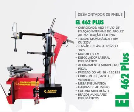 Modelo para montar e desmontar pneus de automóveis, caminhonetes, semi-automática, em rodas de 14″ a 30″ (fixação interna) e de 12″ a 26″ (fixação externa), ideal para rodas esportivas. Dotado de manômetro calibrador, destalonador lateral, mesa de fixação, torre articulável e coluna pneumática. Possui dispositivo auxiliar pneumático para montar/desmontar pneus Hi-Performace (perfil baixo).